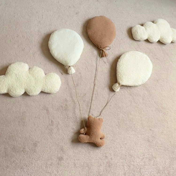 ترکیب ابرهای لطیف و بادکنکهای بامزه با پارچه تدی نرم، فضایی گرم، آرام و کودکانه میسازه که هم برای سیسمونی عالیه، هم برای عکاسی و دکور اتاق.